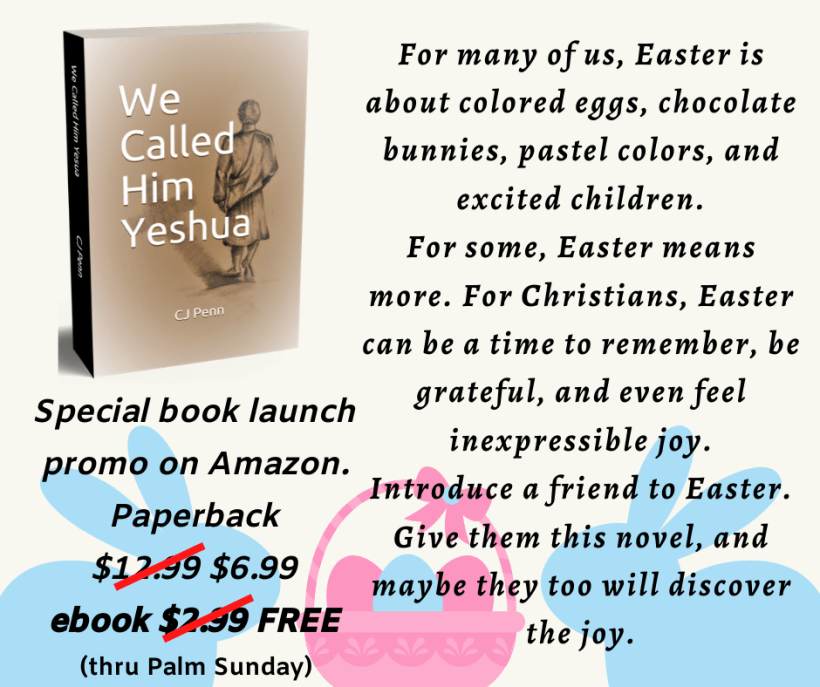 In honor of Palm Sunday, the ebook of “We Called Him Yeshua” is free all this weekend, ending midnight Sunday (Pacific standard time, USA). The paperback remains priced as low as Amazon will allow ($6.99, cost). So if you’d like a copy, now’s a great time to get one. And maybe one for a friend too.