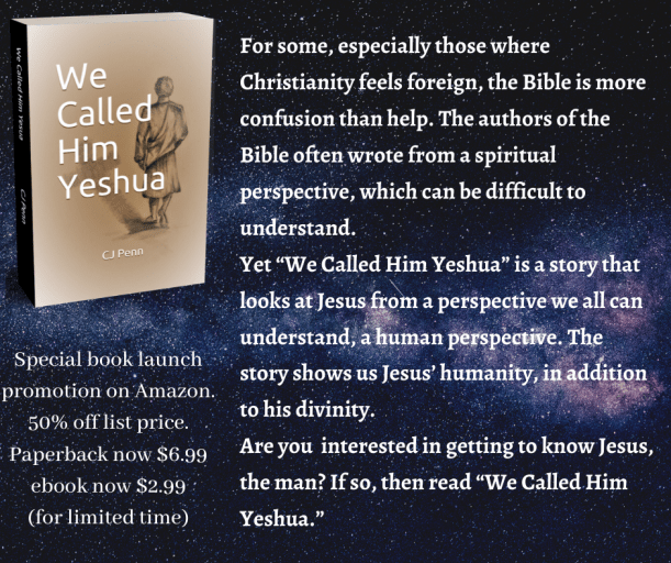 In addition to the ebook being FREE, I’ve dropped the price of the paperback by 20%. The paperback price drop has already taken effect. The ebook being free will take effect midnight tonight (Friday, Oct. 9th). My hope is that people will find the story in “We Called Him Yeshua” a nice distraction from all the stuff we’re currently living through.